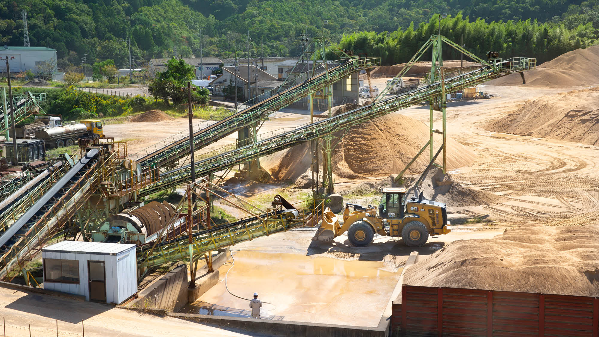 ・京都府南部の城陽市東部丘陵地は、全国有数の砂の産地であり、半世紀以上にわたり、日本における貴重な天然資源である良質な砂利・砂を採取し、主にコンクリート用骨材の供給を通じて、様々な大型インフラ整備に貢献しています。